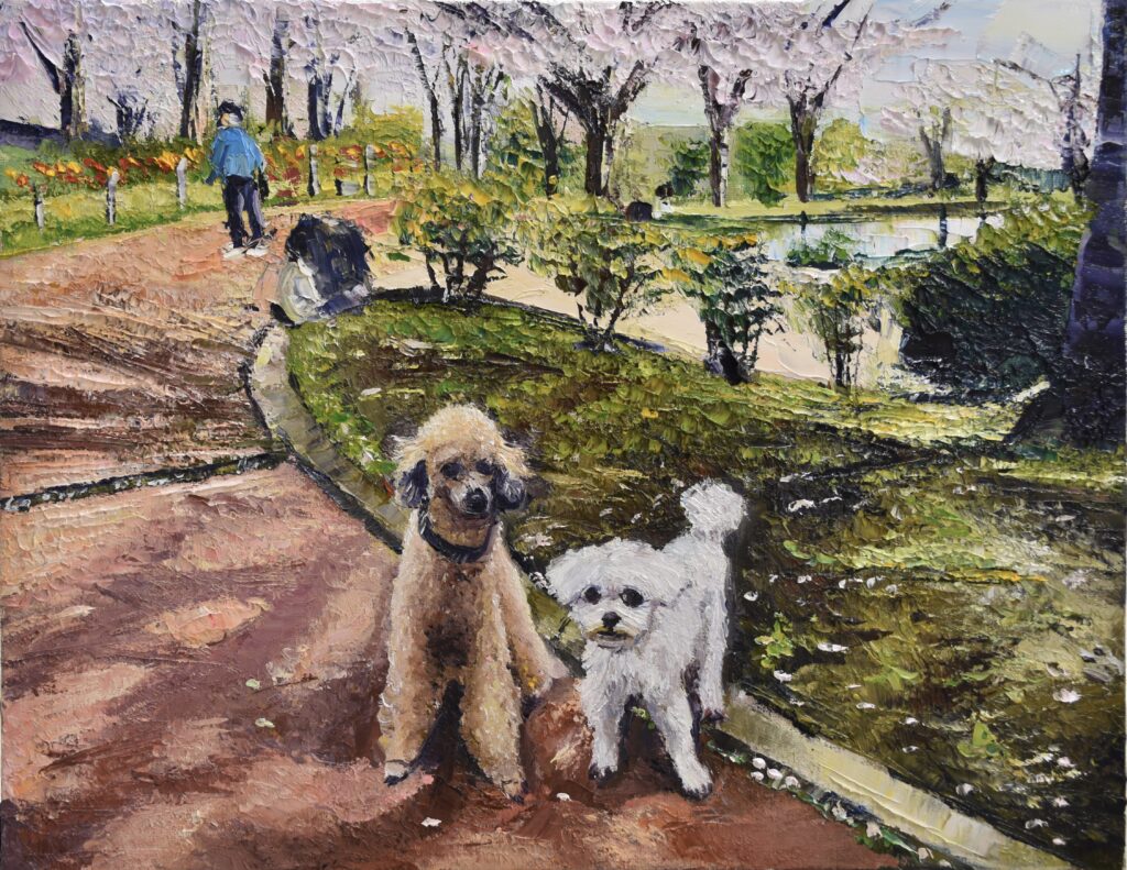 作品制作は、ご依頼主様からお預かりする写真素材を起点として行います。ペットの姿や佇まい、当日の空気感は、ご提供いただいた写真をもとに丁寧に描写いたします。一方で、風景全体の広がりや土地ならではの雰囲気については、必要に応じて公開情報も参照し、情景としての一体感を補完します。