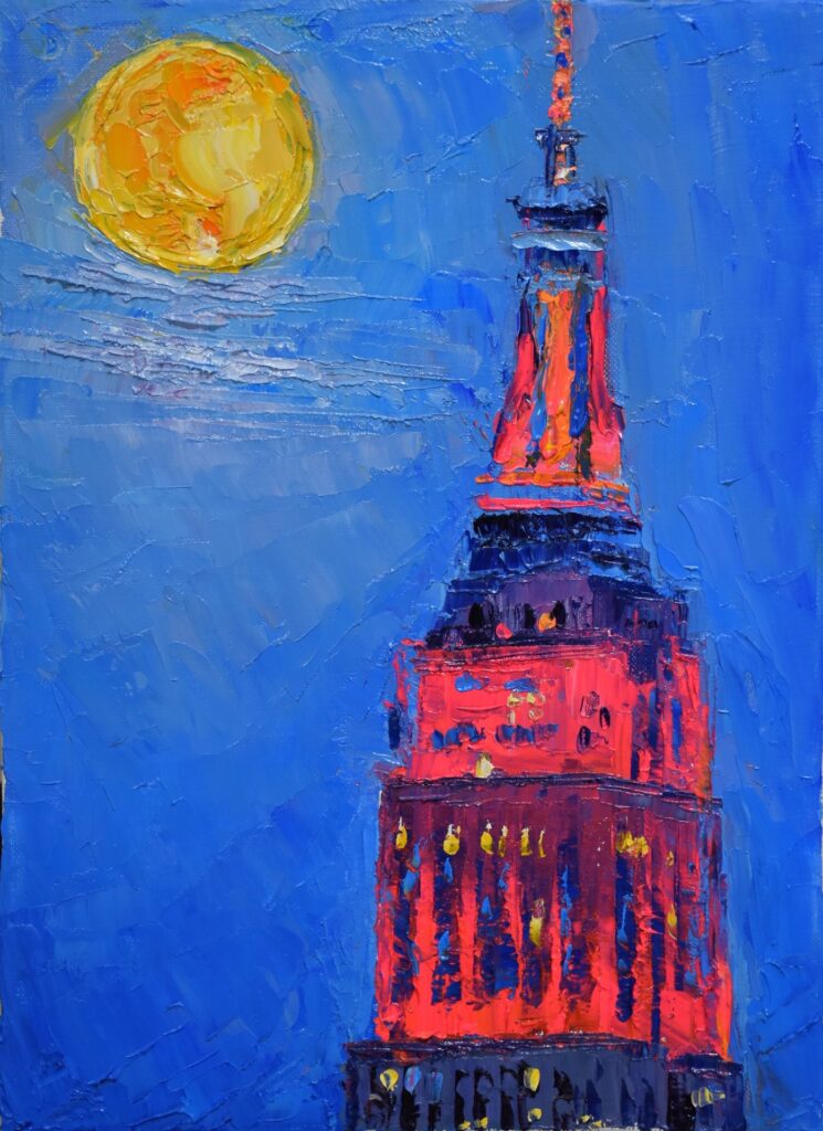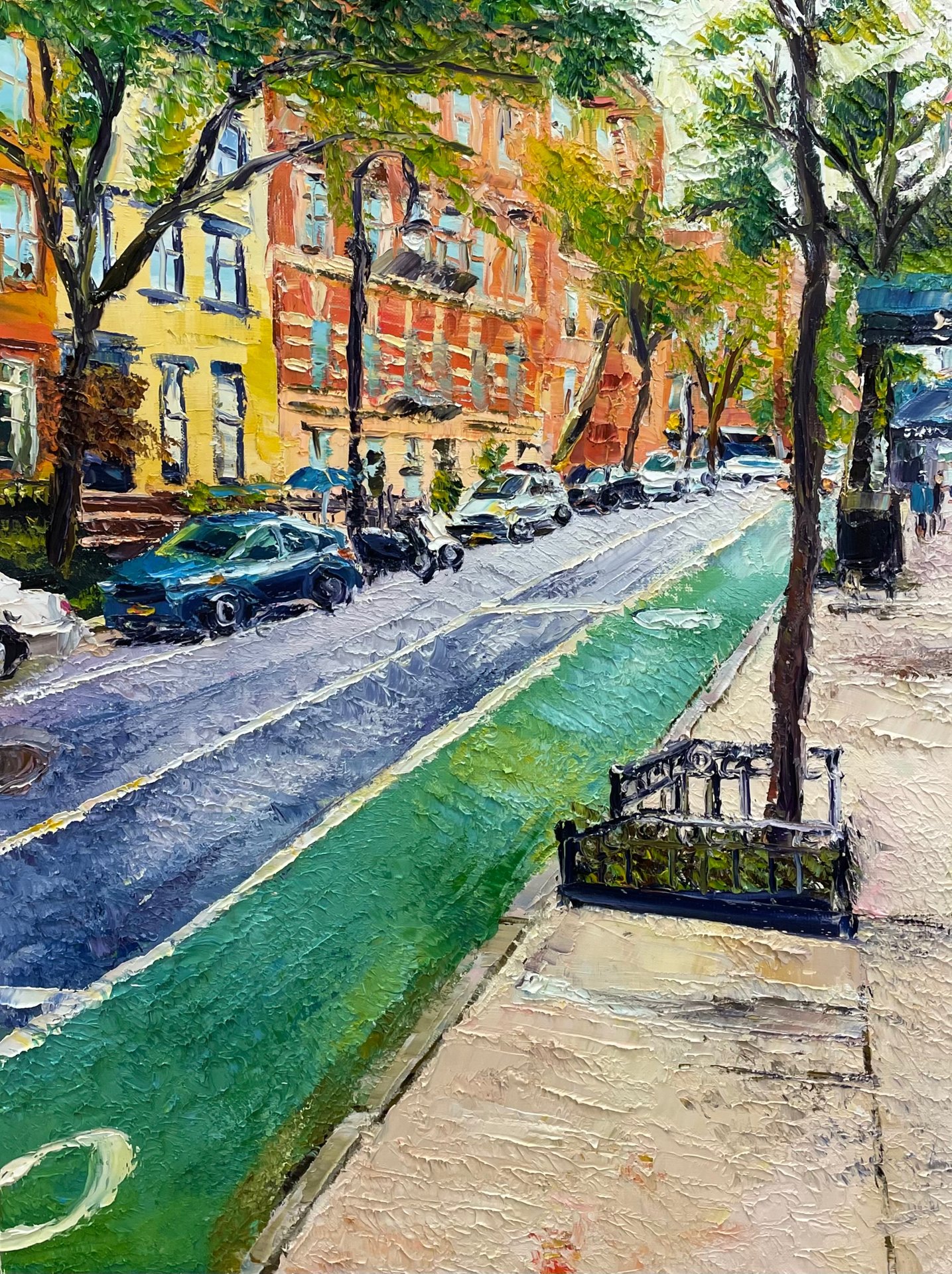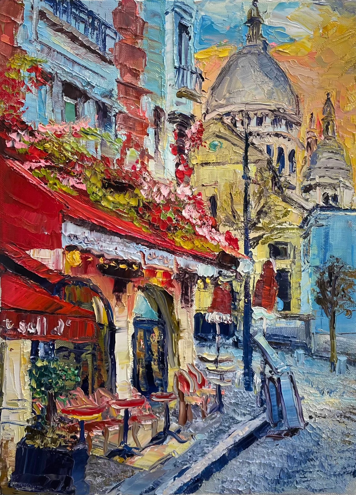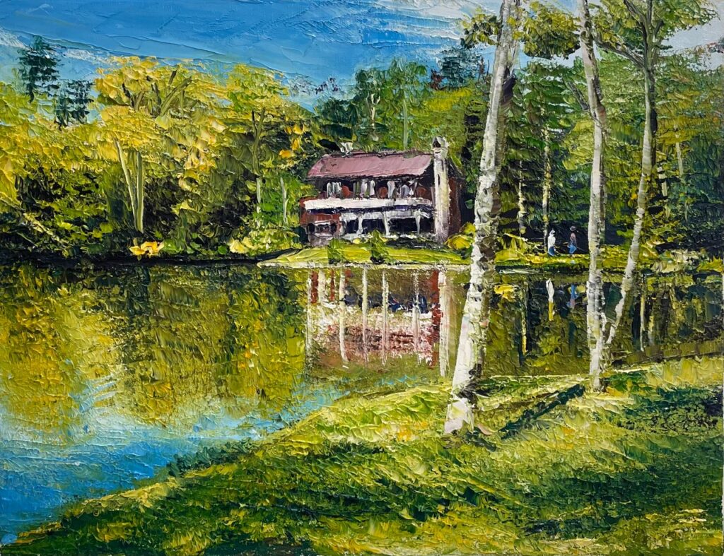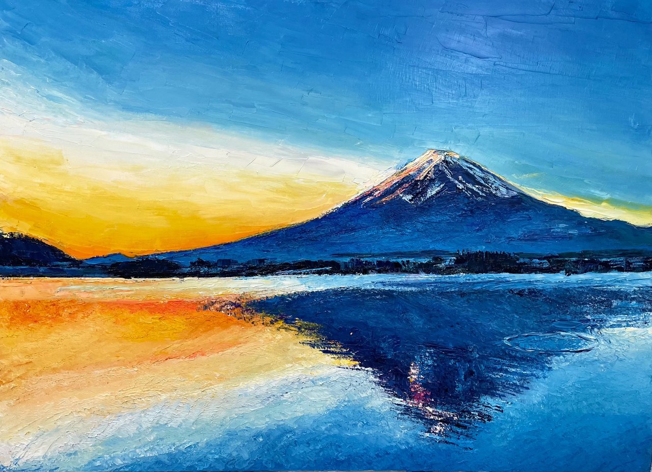 ペインティングナイフのみで色と光を重ねる独自の技法により、現地で感じた空気や記憶までもキャンバスに刻む作品を手がけている。